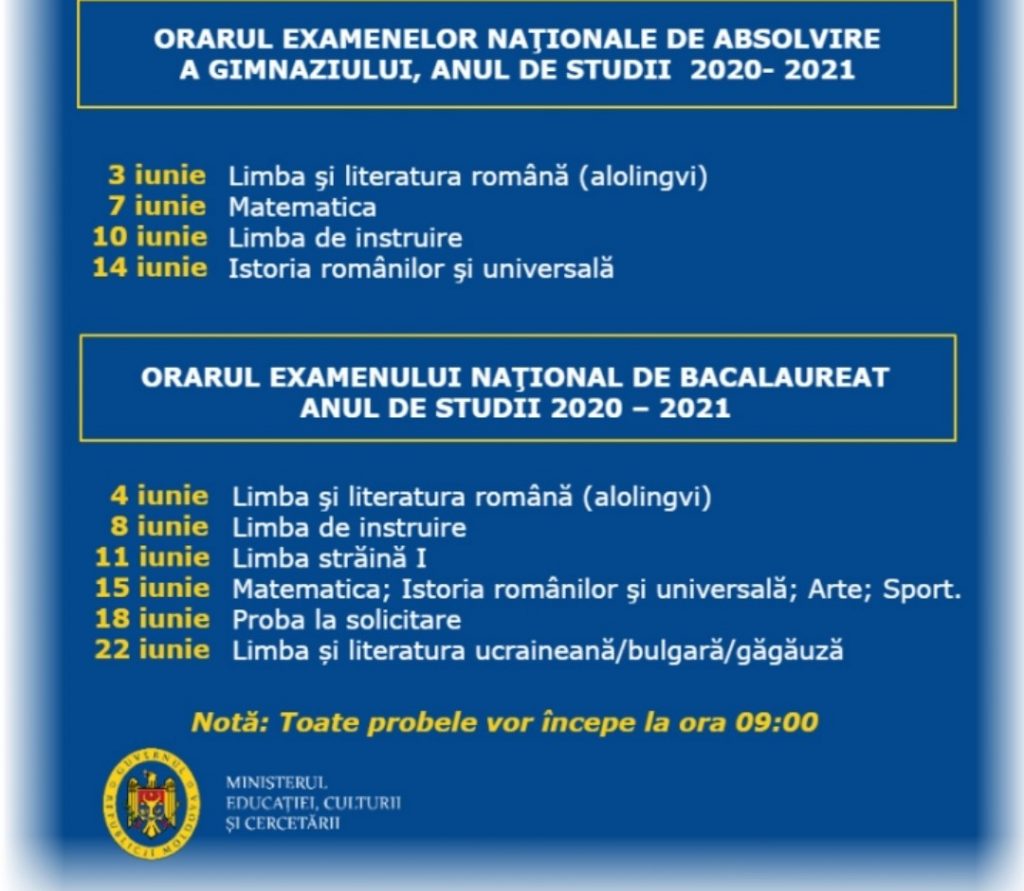 Orarul Examenelor Naționale de Absolvire a Gimnaziului, anul de studii 2020-2021